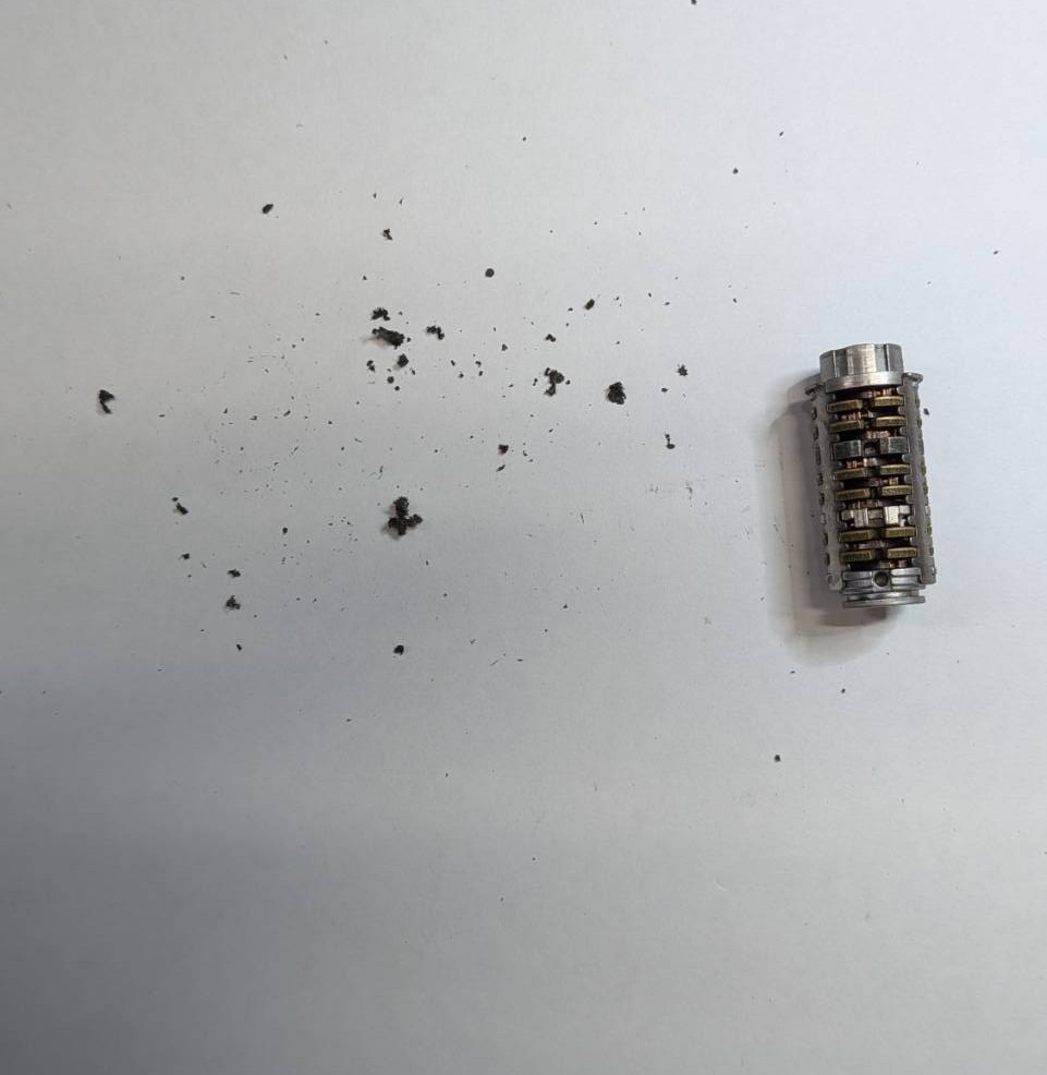 今回の原因として、鍵穴内部の『汚れやホコリ』『潤滑切れ』が考えられる為、鍵穴内部の汚れやホコリを除去し、分解洗浄メンテナンスをさせていただきました。